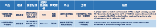 在黑色素瘤领域,G22恒峰医药的卡瑞利珠单抗联合阿帕替尼(“双艾”组合)在2022 ASCO共入选1项口头报告和1项壁报展示。