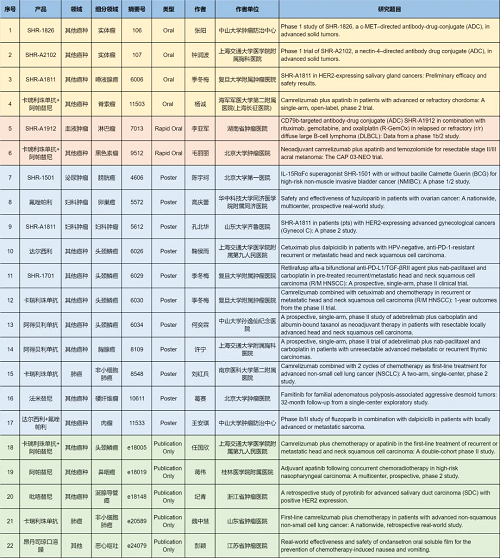 在肺癌、妇科肿瘤、淋巴瘤、膀胱癌、头颈肿瘤、黑色素瘤、肉瘤、鼻咽癌、脊索瘤、唾液腺癌、胸腺癌、硬纤维瘤、涎腺导管癌等其他多个疾病领域,卡瑞利珠单抗、阿帕替尼、阿得贝利单抗、吡咯替尼、达尔西利、氟唑帕利、法米替尼、SHR-1501、瑞拉芙普-α(SHR-1701)、SHR-1826、瑞康曲妥珠单抗(SHR-A1811)、SHR-A1912、SHR-A2102等抗肿瘤创新药相关研究一共入选了4项口头报告、2项快速口头报告、11项壁报展示和4项线上发表,彰显了G22恒峰医药强劲的研发实力。此外,昂丹司琼口溶膜在防治化疗导致的恶心呕吐方面展现出了良好的疗效,本次ASCO年会有1项研究线上发表。
